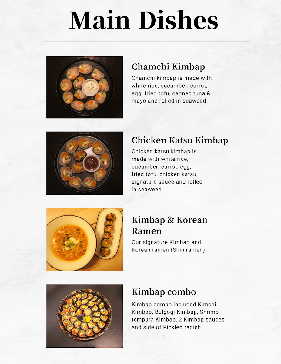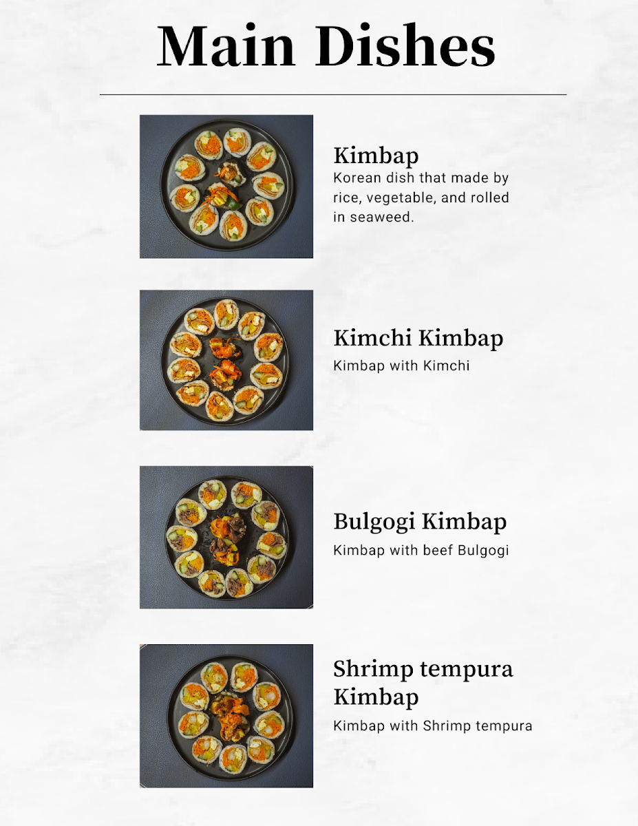 Kimbap festival included 5 kimbaps that you can choose and 3Kimbap sauce on the side