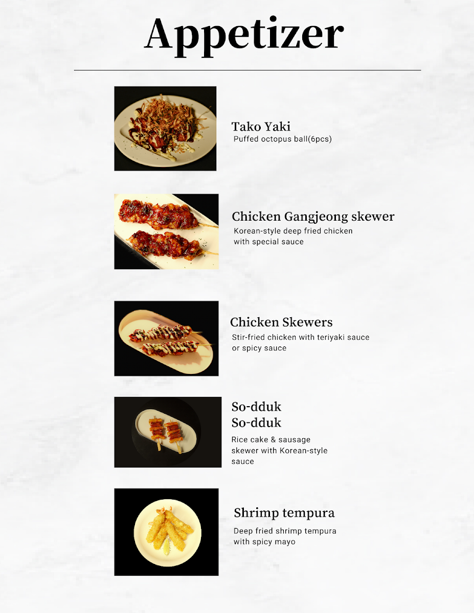 I highly recommend this place. The food here is so good. The rice cake skewers and cheese and potato pancake we had as appetizers were really good and tasty. It's a pretty restaurant with a nice atmosphere.